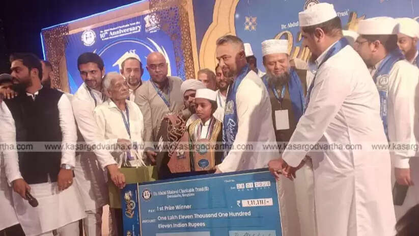 Article Summary: Umar Mukhtar B.M from Patla, Kasaragod, won the first prize in the national level Qira'at competition organized by Dr. Abdul Shakeel Charitable Trust in Mangalore. He beat 2200 contestants to win a cash prize of ₹1,11,111 and was honored with a 'Bisht'.