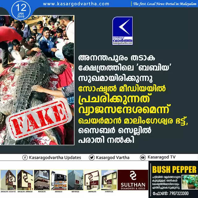 അനന്തപുരം തടാക ക്ഷേത്രത്തിലെ 'ബബിയ' സുഖമായിരിക്കുന്നു; സോഷ്യല് മീഡിയയില് പ്രചരിക്കുന്നത് വ്യാജസന്ദേശമെന്ന് ചെയര്മാന് മാലിംഗേശ്വര ഭട്ട്, സൈബര് സെല്ലില് പരാതി നല്കി