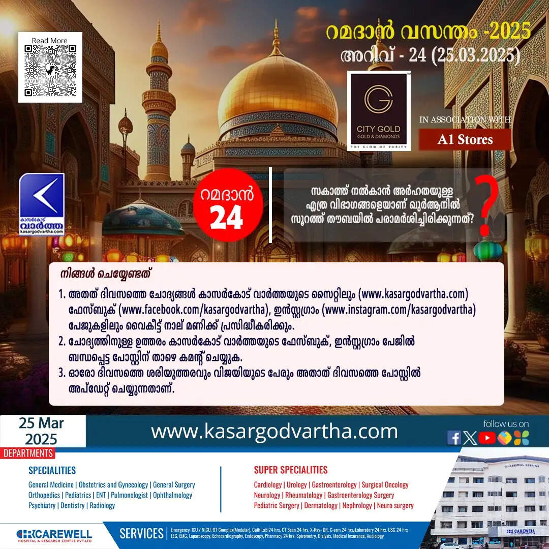 (KasargodVartha) അറിവ് - 24 (25.03.2025): സകാത്ത് നൽകാൻ അർഹതയുള്ള എത്ര വിഭാഗങ്ങളെയാണ് ഖുർആനിൽ സൂറത്ത് തൗബയിൽ പരാമർശിച്ചിരിക്കുന്നത്?