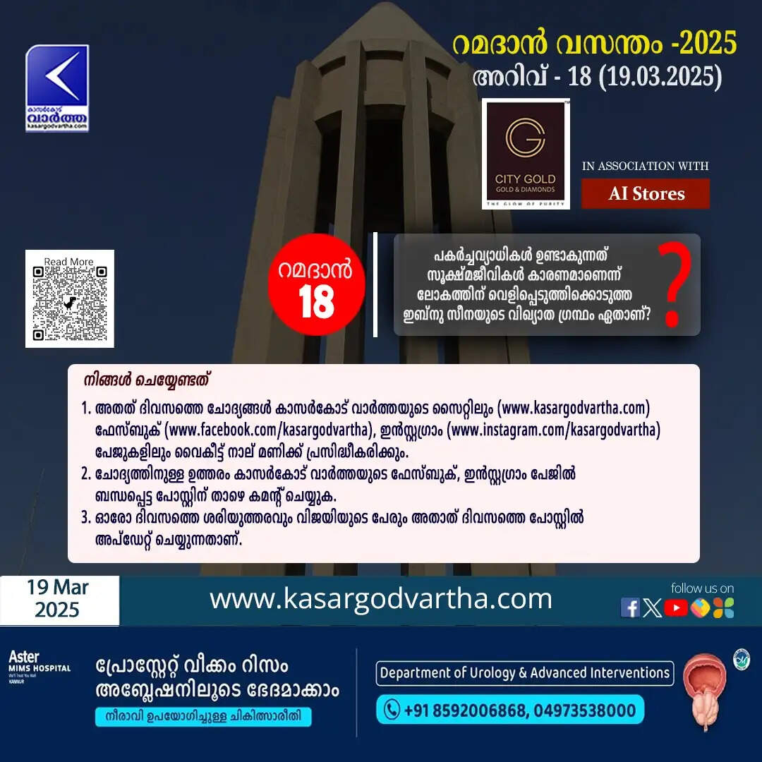 (KasargodVartha) അറിവ് - 18 (19.03.2025): പകർച്ചവ്യാധികൾ ഉണ്ടാകുന്നത് സൂക്ഷ്മജീവികൾ കാരണമാണെന്ന് ലോകത്തിന് വെളിപ്പെടുത്തിക്കൊടുത്ത ഇബ്നു സീനയുടെ വിഖ്യാത ഗ്രന്ഥം ഏതാണ്?