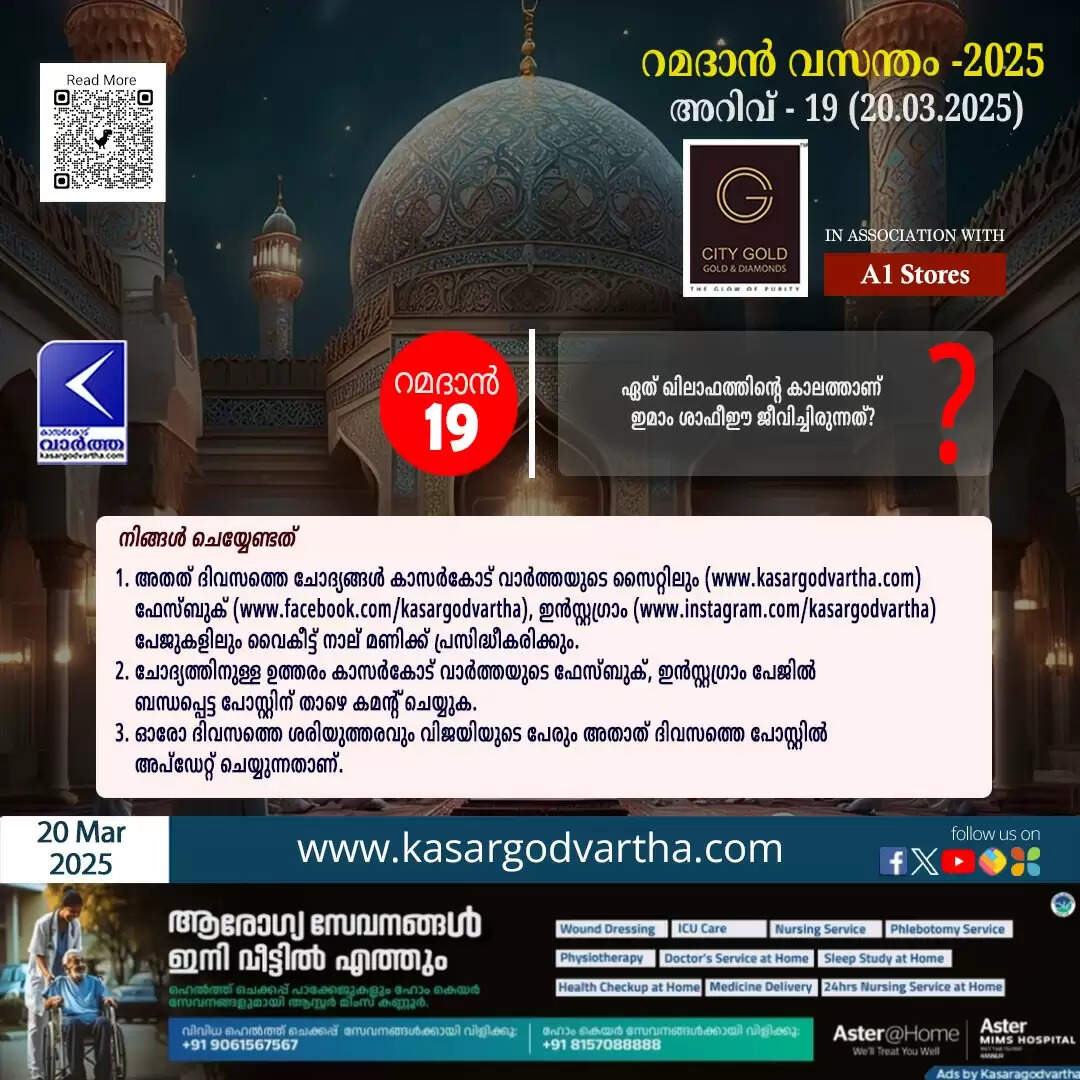 (KasargodVartha) അറിവ് - 19 (20.03.2025): ഏത് ഖിലാഫത്തിന്റെ കാലത്താണ് ഇമാം ശാഫീഈ ജീവിച്ചിരുന്നത്?