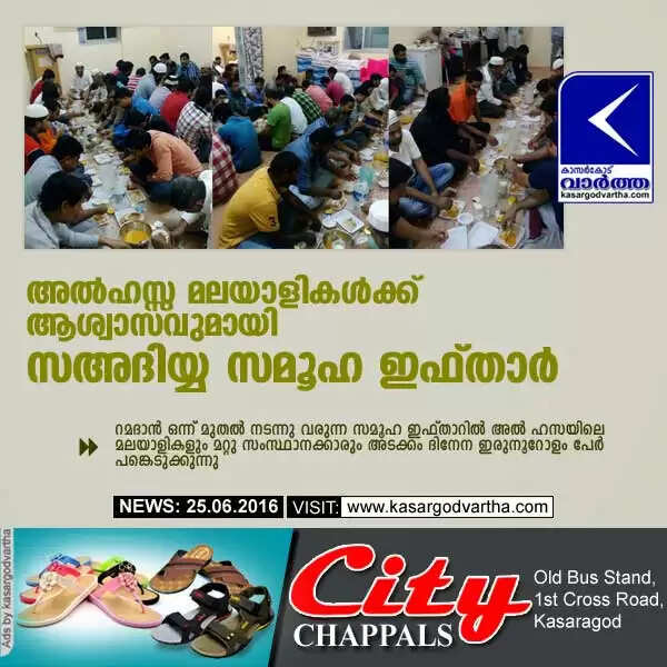 അല്ഹസ്സ: (www.kasargodvartha.com 25/06/2016) മലയാളികളടക്കമുള്ള വിദേശികള്ക്ക് ആശ്വാസമായി അല്ഹസ്സ സഅദിയ്യ സമൂഹ ഇഫ്താര് ശ്രദ്ധേയമാകുന്നു. റമദാന് ഒന്ന് മുതല് നടന്നു വരുന്ന സമൂഹ ഇഫ്താറില് അല് ഹസയിലെ മലയാളികളും മറ്റു സംസ്ഥാനക്കാരും അടക്കം ദിനേന ഇരുനൂറോളം പേര് പങ്കെടുക്കുന്നു. ജാമിഅ സഅദിയ്യ അറബിയ്യയുടെ അല്ഹസ്സ കമ്മിറ്റിയാണ് ആറു വര്ഷമായി മുടങ്ങാതെ ഈസംരംഭം നടത്തി വരുന്നത്.