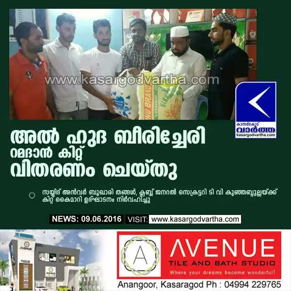 തൃക്കരിപ്പൂര്‍: (www.kasargodvartha.com 09.06.2016) തൃക്കരിപ്പൂരിന്റെ കലാ - കായിക - സാംസ്‌കാരിക - ജീവകാരുണ്യ - വിദ്യാഭ്യാസ രംഗത്ത് 15 വര്‍ഷമായി ശ്രദ്ധേയമായ ചുവടുവെപ്പുമായി മുന്നേറുന്ന ബീരിച്ചേരി അല്‍ ഹുദ ആര്‍ട്‌സ് ആന്‍ഡ് സ്‌പോര്‍ട്‌സ് ക്ലബ്ബ് റമദാന്‍ റിലീഫിന്റെ ഒന്നാം ഘട്ട വിതരണോദ്ഘാടനം സയ്യിദ് അന്‍വര്‍ ബുഖാരി തങ്ങള്‍, ക്ലബ്ബ് ജനറല്‍ സെക്രട്ടറി ടി വി കുഞ്ഞബ്ദുല്ലയ്ക്ക് നല്‍കി നിര്‍വഹിച്ചു. സര്‍വ മേഖലകളിലും കുതിച്ചു ചാട്ടം നടത്തി മറ്റു ക്ലബ്ബുകള്‍ക്കും സംഘടനകള്‍ക്കും മാതൃകയായി മാറിയ അല്‍ ഹുദയുടെ നിലനില്‍പ്പിന്റെ ആധാരം, നിരാലംബരുടെ കണ്ണീരൊപ്പാന്‍ 2001 ല്‍ അതിന്റെ ആരംഭം മുതല്‍ മുടങ്ങാതെ നടത്തിവരുന്ന ഇത്തരം റിലീഫ് പ്രവര്‍ത്തനങ്ങളാണ്.