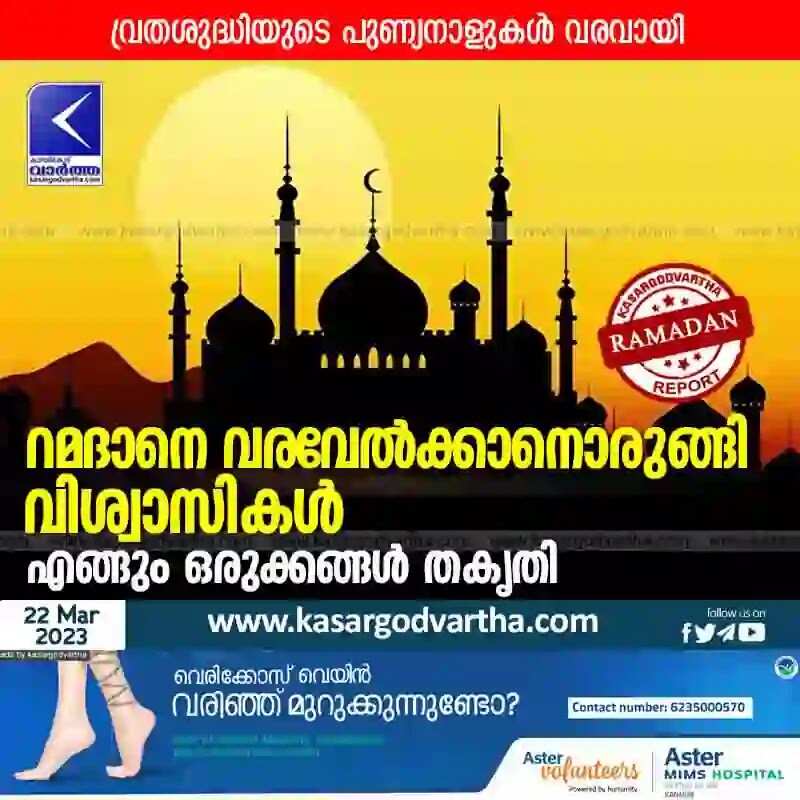കാസർകോട്: (www.kasargodvartha.com) വിശുദ്ധ റമദാനെ വരവേല്‍ക്കാനൊരുങ്ങി ഇസ്ലാം മത വിശ്വാസികൾ. ബുധനാഴ്ച സൂര്യാസ്തമയത്തിന് ശേഷം മാസപ്പിറവി കണ്ടാല്‍ കേരളത്തില്‍ വ്യാഴാഴ്ച റമദാന്‍ ഒന്നായിരിക്കും. തുടർന്നുള്ള ഒരുമാസക്കാലം വ്രതവും ആരാധനകളും ധാനധർമങ്ങളുമൊക്കെയായി വിശ്വാസികൾ റമദാനെ ധന്യമാക്കും. മസ്‌ജിദുകളിലും വീടുകളിലും ഇതിനോടകം ഒരുക്കങ്ങൾ പൂർത്തിയായിട്ടുണ്ട്. മസ്ജിദുകള്‍ പെയിന്റടിച്ചും നവീകരണ പ്രവർത്തനങ്ങൾ നടത്തിയും മറ്റും മനോഹരമാക്കി കഴിഞ്ഞു. നോമ്പുതുറയ്ക്കുള്ള സൗകര്യങ്ങളും ഒരുക്കിയിട്ടുണ്ട്.