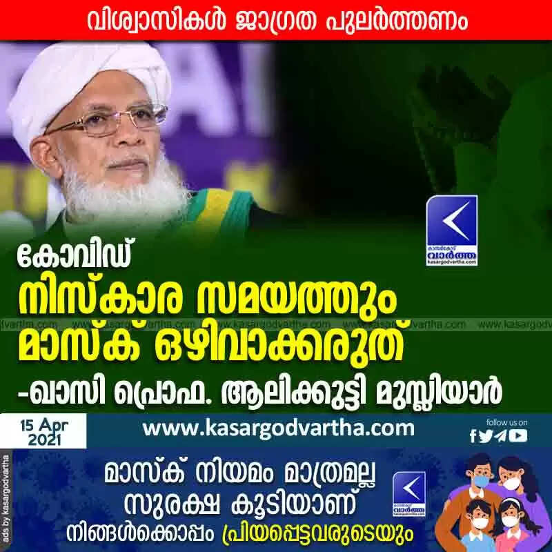 കോവിഡ്: വിശ്വാസികൾ ജാഗ്രത പുലർത്തണം, നിസ്കാര സമയത്തും മാസ്ക് ഒഴിവാക്കരുത് - ഖാസി പ്രൊഫ. ആലിക്കുട്ടി മുസ്ലിയാർ