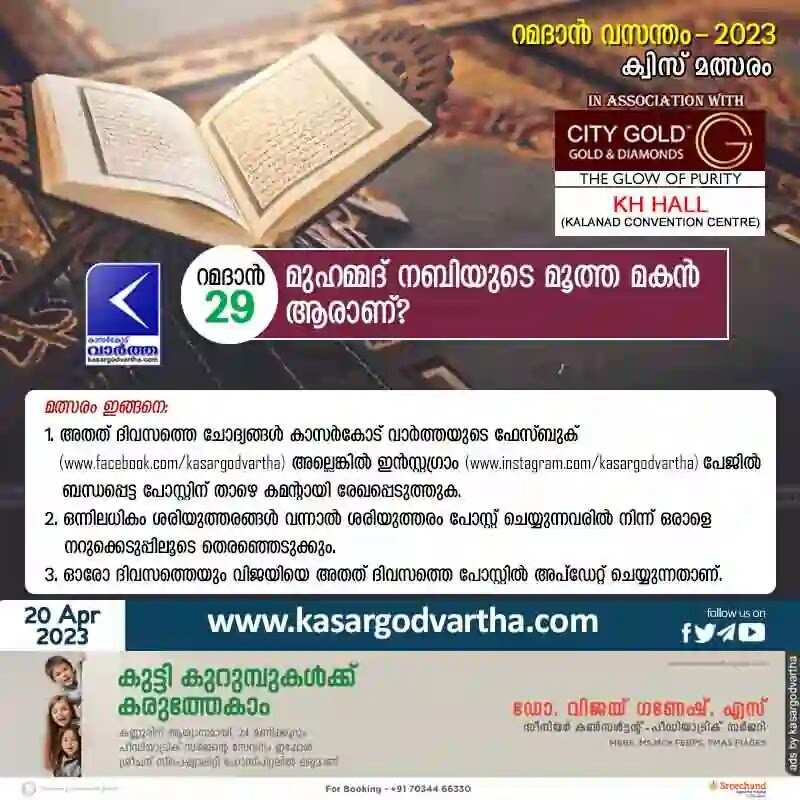 Keywords: Ramadan-Quiz, Islamic-History, Malayalam Islamic Quiz, Day 29: Who was prophet's first child? Ramadan Vasantham 2023 - Kasargodvartha Quiz Competition.