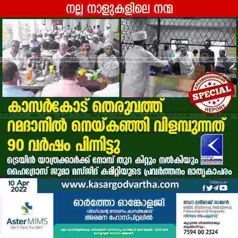 കാസർകോട് തെരുവത്ത് റമദാനിൽ നെയ്കഞ്ഞി വിളമ്പുന്നത് 90 വർഷം പിന്നിട്ടു; ട്രെയിൻ യാത്രക്കാർക്ക് നോമ്പ് തുറ കിറ്റും നൽകിയും ഹൈദ്രോസ് ജുമാ മസ്ജിദ് കമിറ്റിയുടെ പ്രവർത്തനം മാതൃകാപരം