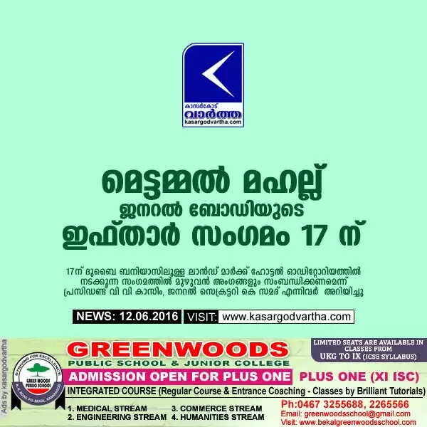 ദുബൈ: (www.kasargodvartha.com 12/06/2016) മെട്ടമ്മല്‍ മഹല്ല് ജനറല്‍ ബോഡിയുടെ യു എ ഇ തല വാര്‍ഷിക ജനറല്‍ ബോഡിയും സമൂഹ നോമ്പ് തുറയും 17ന് ദുബൈ ബനിയാസിലുള്ള ലാന്‍ഡ് മാര്‍ക്ക് ഹോട്ടല്‍ ഓഡിറ്റോറിയത്തില്‍ നടക്കും. സംഗമത്തിലേക്ക് യു എ ഇയിലുള്ള മുഴുവന്‍ മഹല്‍ നിവാസികളെയും സ്വാഗതം ചെയ്യുന്നതായി ബന്ധപ്പെട്ടവര്‍ അറിയിച്ചു.