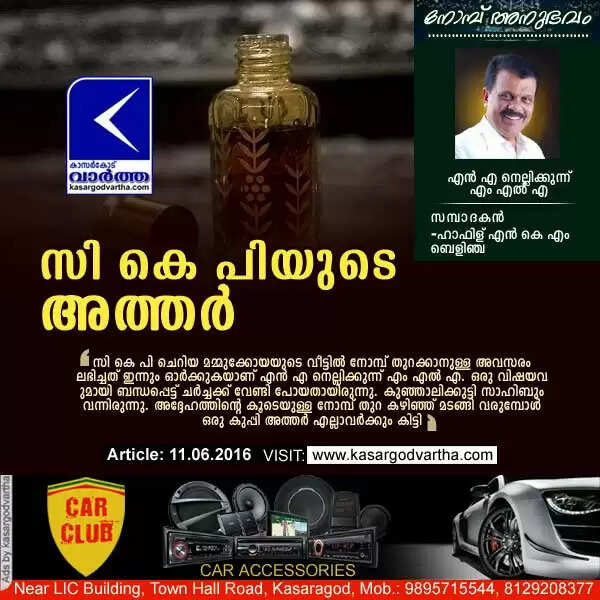 സി കെ പി ചെറിയ മമ്മുക്കോയയുടെ വീട്ടില് നോമ്പ് തുറക്കാനുള്ള അവസരം ലഭിച്ചത് ഇന്നും ഓര്ക്കുകയാണ് എന് എ നെല്ലിക്കുന്ന് എം എല് എ. ഒരു വിഷയവുമായി ബന്ധപ്പെട്ട് ചര്ച്ചക്ക് വേണ്ടി പോയതായിരുന്നു. കുഞ്ഞാലിക്കുട്ടി സാഹിബും വന്നിരുന്നു. അദ്ദേഹത്തിന്റെ കൂടെയുള്ള നോമ്പ് തുറ കഴിഞ്ഞ് മടങ്ങി വരുമ്പോള് ഒരു കുപ്പി അത്തര് എല്ലാവര്ക്കും കിട്ടി. ഇതിന്റെ രഹസ്യം അന്വേഷിച്ചപ്പോഴാണ് ഈ അത്തര് ഗിഫ്റ്റ് റമദാനില് അവിടത്തെ പതിവാണെന്ന് മനസിലാകുന്നത്. ഇന്നും മായാത്ത ഓര്മയായി അവശേഷിക്കുകയാണ് ആ നോമ്പ് തുറ.