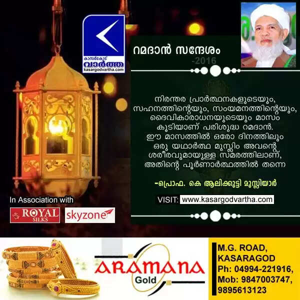 (www.kasargodvartha.com 07/06/2016) നിരന്തര പ്രാര്ത്ഥനകളുടെയും, സഹനത്തിന്റെയും, സംയമനത്തിന്റെയും, ദൈവികാരാധനയുടെയും മാസം കൂടിയാണ് പരിശുദ്ധ റമദാന്. ഈ മാസത്തില് ഒരോ ദിനത്തിലും ഒരു യഥാര്ത്ഥ മുസ്ലിം അവന്റെ ശരീരവുമായുള്ള സമരത്തിലാണ്, അതിന്റെ പൂര്ണാര്ത്ഥത്തില് തന്നെ.