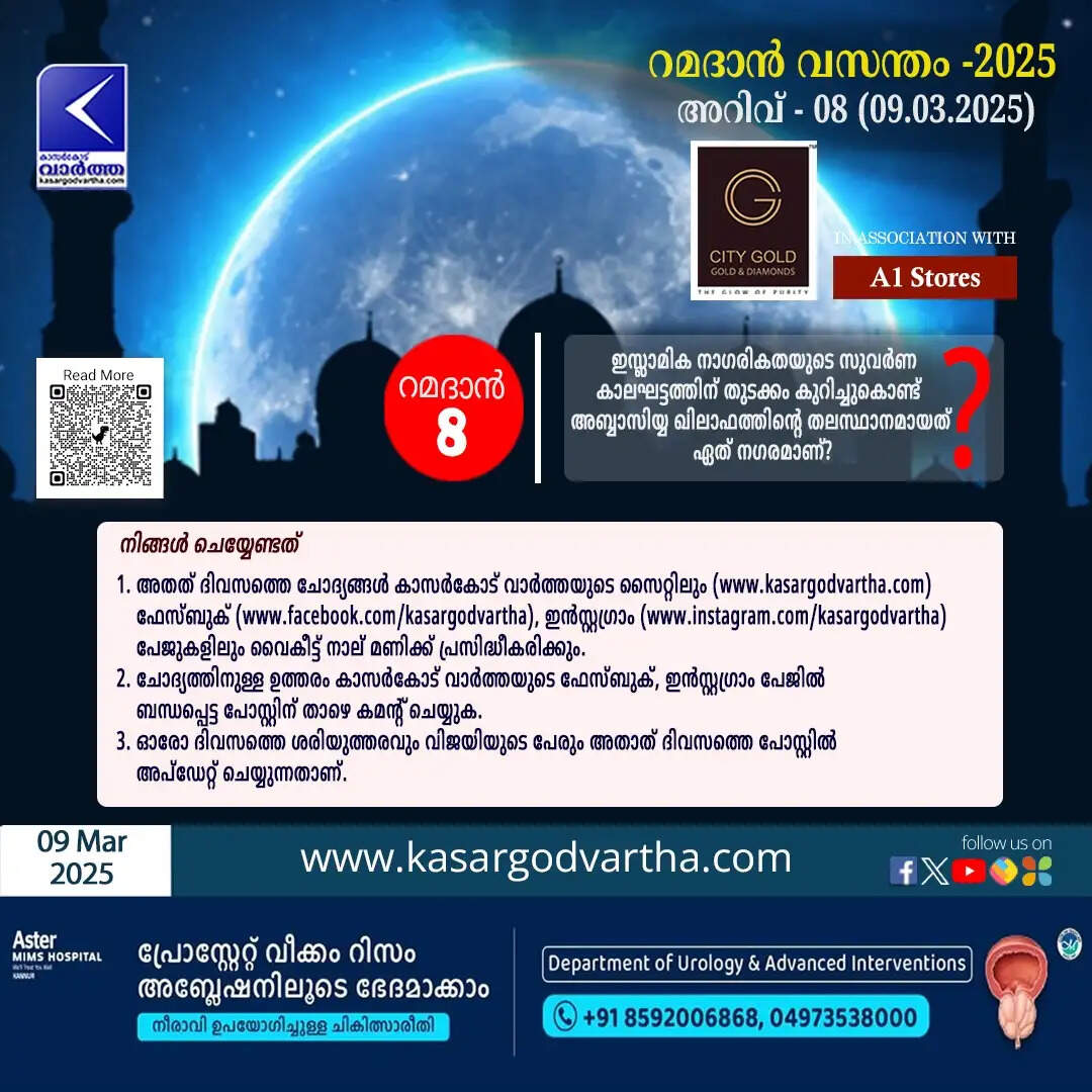(KasargodVartha) അറിവ് - 08 (09.03.2025): ഇസ്ലാമിക നാഗരികതയുടെ സുവർണ കാലഘട്ടത്തിന് തുടക്കം കുറിച്ചുകൊണ്ട് അബ്ബാസി ഖിലാഫത്തിന്റെ തലസ്ഥാനമായത് ഏത് നഗരമാണ്?