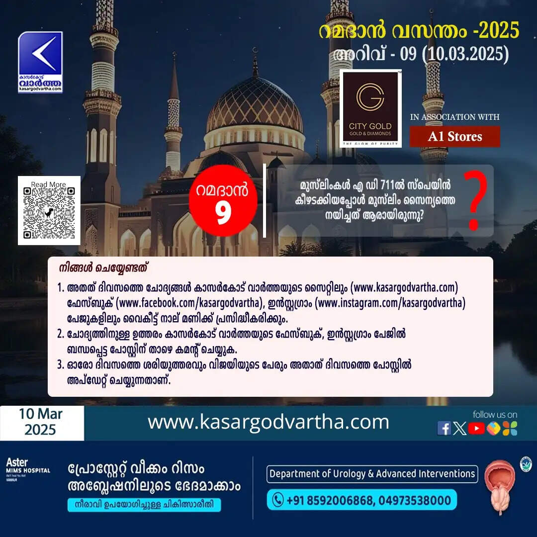(KasargodVartha) അറിവ് - 09 (10.03.2025): മുസ്ലിംകൾ എ ഡി 711ൽ സ്പെയിൻ കീഴടക്കിയപ്പോൾ മുസ്ലിം സൈന്യത്തെ നയിച്ചത് ആരായിരുന്നു?