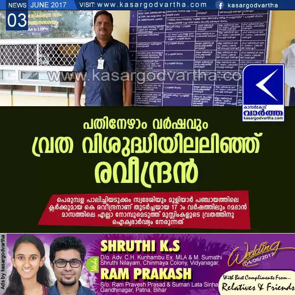 ബോവിക്കാനം: (www.kasargodvartha.com 03/06/2017) ഈ വര്ഷവും മുഴുവന് നോമ്പെടുക്കാനൊരുങ്ങി തുടര്ച്ചയായ 17 -ാം വര്ഷവും വ്രത വിശുദ്ധിയിലലിഞ്ഞു ചേരുകയാണ് രവീന്ദ്രന്. പെരുമ്പള പാലിച്ചിയടുക്കം സ്വദേശിയും മുളിയാര് പഞ്ചായത്തിലെ ക്ലര്ക്കുമായ കെ രവീന്ദ്രനാണ് തുടര്ച്ചയായ 17 -ാം വര്ഷത്തിലും റമദാന് മാസത്തിലെ എല്ലാ നോമ്പുമെടുത്ത് മുസ്ലിംകളുടെ വ്രതത്തിനു ഐക്യദാര്ഢ്യം നേരുന്നത്.