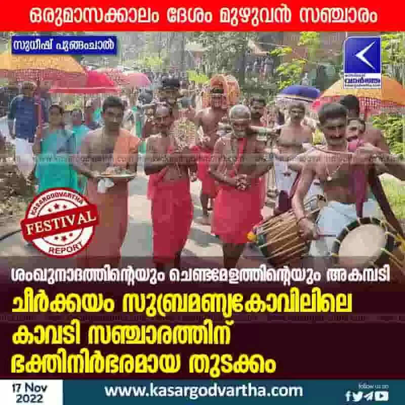 Temple fest | ശംഖുനാദത്തിന്റെയും ചെണ്ടമേളത്തിന്റെയും അകമ്പടി; ചീര്ക്കയം സുബ്രമണ്യകോവിലിലെ കാവടി സഞ്ചാരത്തിന് ഭക്തിനിര്ഭരമായ തുടക്കം