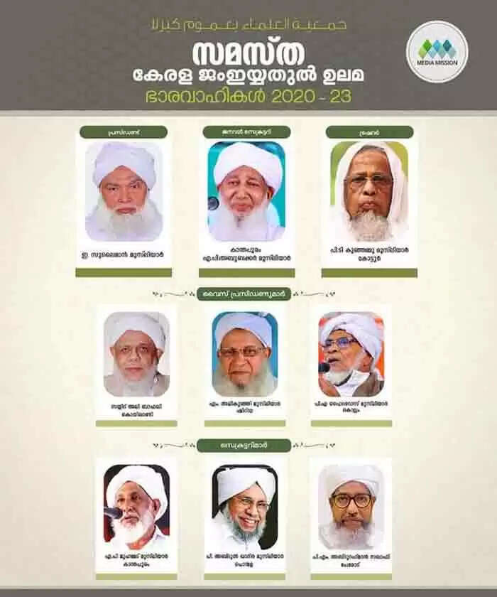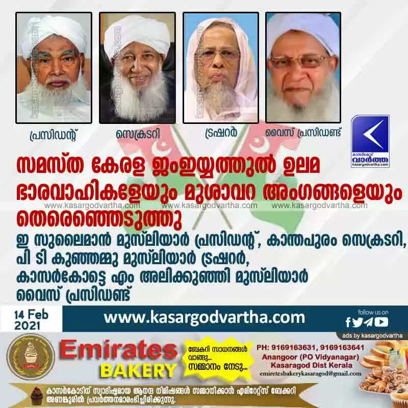 സമസ്ത കേരള ജംഇയ്യത്തുൽ ഉലമ ഭാരവാഹികളേയും മുശാവറ അംഗങ്ങളെയും തെരെഞ്ഞെടുത്തു; ഇ സുലൈമാൻ മുസ്ലിയാർ പ്രസിഡൻ്റ്, കാന്തപുരം സെക്രടറി, പി ടി കുഞ്ഞമ്മു മുസ്ലിയാർ ട്രഷറർ, കാസർകോട്ടെ എം അലിക്കുഞ്ഞി മുസ്ലിയാർ വൈസ് പ്രസിഡണ്ട്