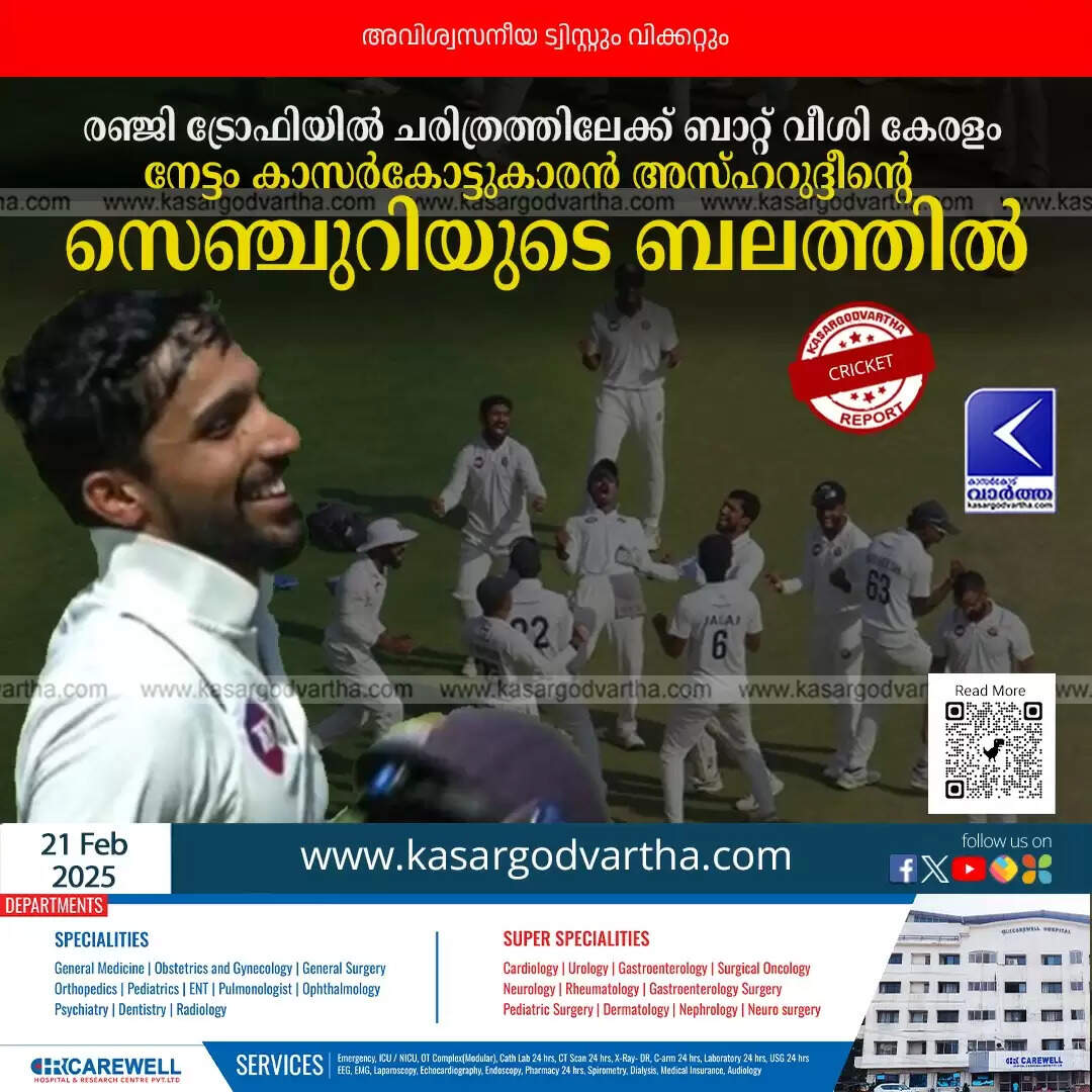Cricket | അവിശ്വസനീയ ട്വിസ്റ്റും വിക്കറ്റും; രഞ്ജി ട്രോഫിയില് ചരിത്രത്തിലേക്ക് ബാറ്റ് വീശി കേരളം; നേട്ടം കാസര്കോട്ടുകാരന് അസ്ഹറുദ്ദീന്റെ സെഞ്ചുറിയുടെ ബലത്തില്