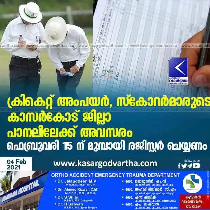 Key words: Kasaragod, News, Local, Cricket, Umpire, Score, Association, Training, Test, Registration, Opportunity for Kasaragod District Panel of Cricket Umpires and Scorers; register before February 15.