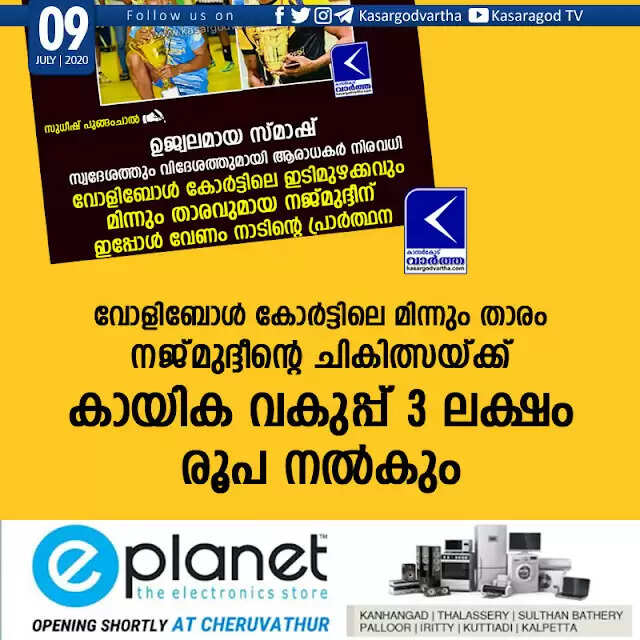 ഉജ്ജലമായ സ്മാഷുകള്‍ കൊണ്ട് വോളിബോള്‍ കോര്‍ട്ടില്‍ നിറഞ്ഞാടിയിരുന്ന വെള്ളരിക്കുണ്ട് കല്ലംചിറയിലെ നജ്മുദ്ദീന്റെ നിലവിലെ ദയനീയ സ്ഥിതി ആദ്യം പുറത്ത് കൊണ്ടുവന്നത് കാസര്‍കോട് വാര്‍ത്തയായിരുന്നു.ഈ വാര്‍ത്തയുടെ ചുവട് പിടിച്ച് മറ്റു മാധ്യമങ്ങളും നജ്മുദ്ദീന്റെ വാര്‍ത്ത നല്‍കുകയായിരുന്നു.