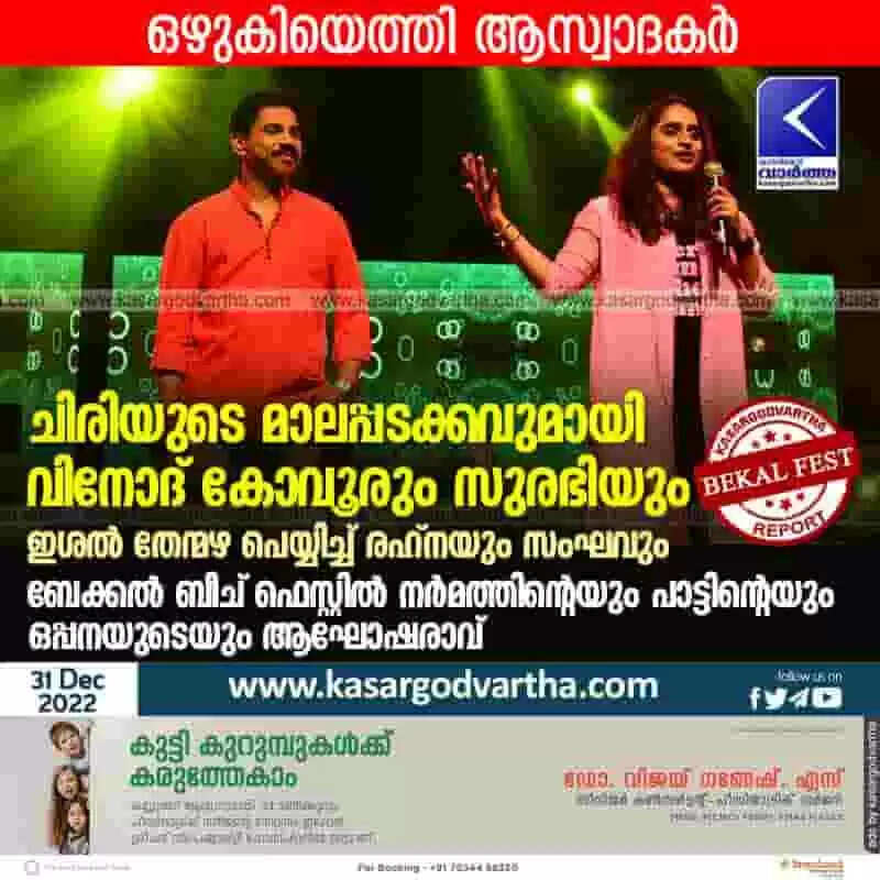 Bekal Fest | ചിരിയുടെ മാലപ്പടക്കവുമായി വിനോദ് കോവൂരും സുരഭിയും; ഇശല് തേന്മഴ പെയ്യിച്ച് രഹ്നയും സംഘവും; ബേക്കല് ബീച് ഫെസ്റ്റില് നര്മത്തിന്റെയും പാട്ടിന്റെയും ഒപ്പനയുടെയും ആഘോഷരാവ്; തദ്ദേശ സ്ഥാപനങ്ങള് ടൂറിസത്തിന്റെ പ്രയോക്താക്കളാകണമെന്ന് ഡോ. ജിജു പി അലക്സ്