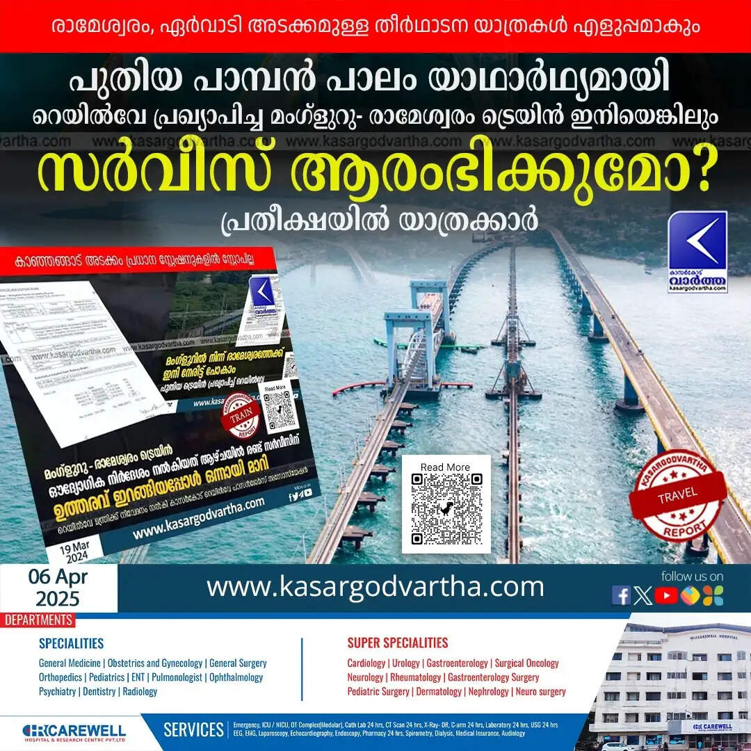 Travel | പുതിയ പാമ്പൻ പാലം യാഥാർഥ്യമായി; റെയിൽവേ പ്രഖ്യാപിച്ച മംഗ്ളുറു- രാമേശ്വരം ട്രെയിൻ ഇനിയെങ്കിലും സർവീസ് ആരംഭിക്കുമോ? പ്രതീക്ഷയിൽ യാത്രക്കാർ