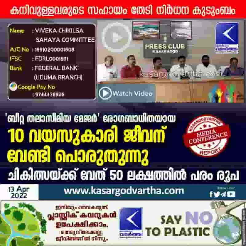 കാസർകോട്: (www.kasargodvartha.com 13.04.2022) ജന്മനാല് തന്നെ ബീറ്റ തലാസീമിയ മേജര് എന്ന മാരകമായ അസുഖം ബാധിച്ച് ദുരിതം അനുഭവിക്കുന്ന പള്ളിക്കര പഞ്ചായത് പരിധിയിലെ നിർധന കുടുംബത്തിലെ 10 വയസുകാരിയുടെ ചികിത്സ ധനസഹായത്തിൽ പങ്കാളിയാകണമെന്ന് ജനപ്രതിനിധികളും കമിറ്റി ഭാരവാഹികളും വാർത്താസമ്മേളനത്തിൽ അഭ്യർഥിച്ചു.