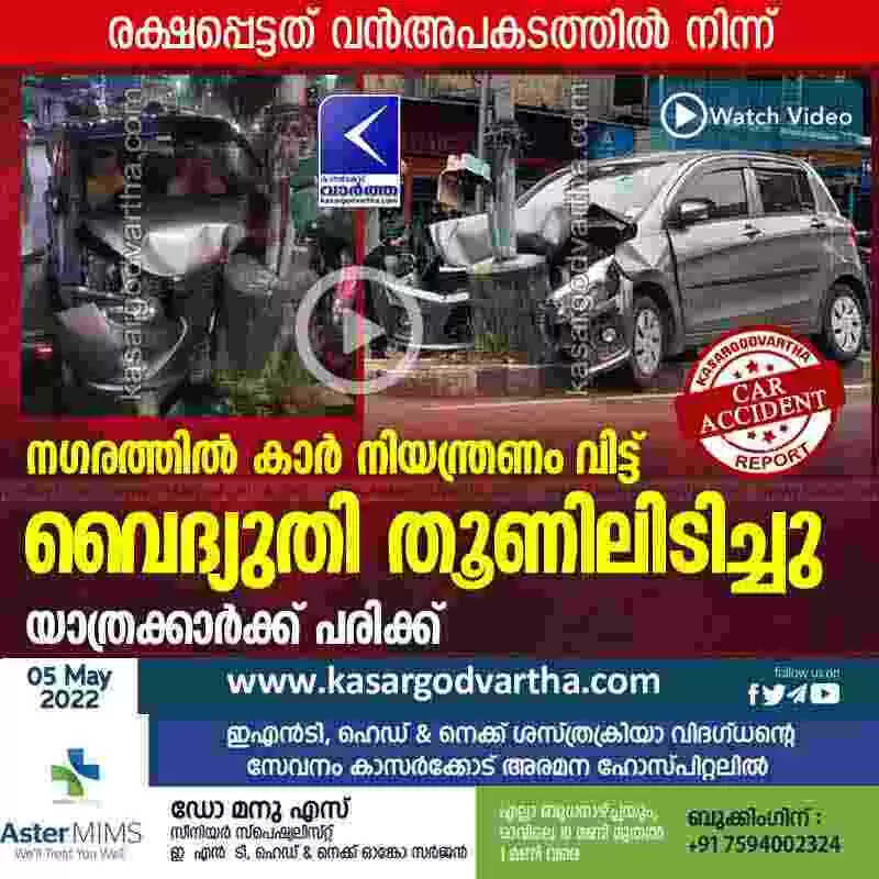 Car Accident | നഗരത്തിൽ കാർ നിയന്ത്രണം വിട്ട് വൈദ്യുതി തൂണിലിടിച്ചു; യാത്രക്കാർക്ക് പരിക്ക്