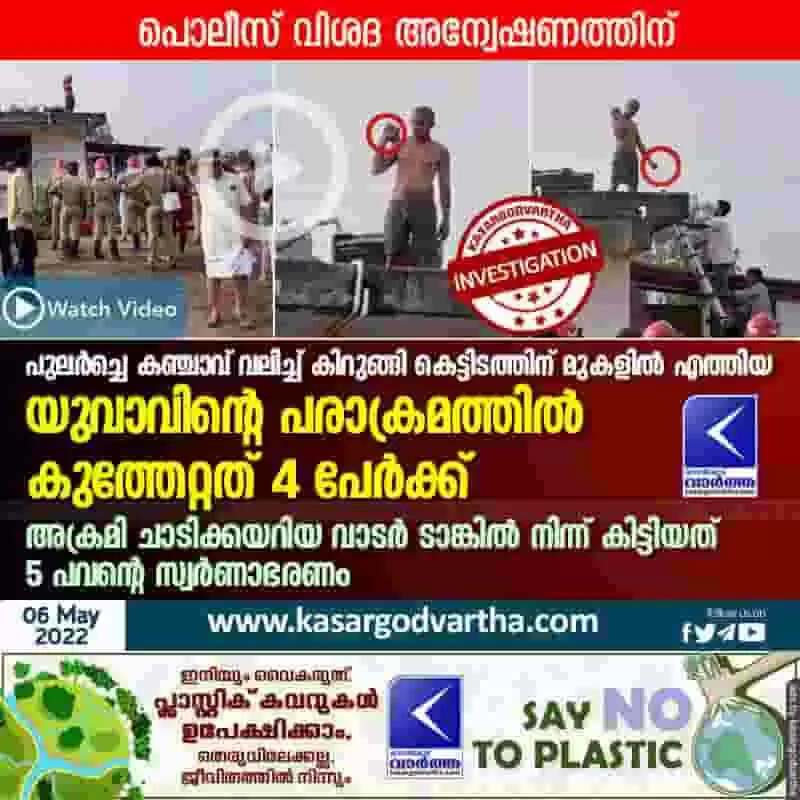 വെള്ളിയാഴ്ച പുലര്ചെ ഉപ്പളയിലാണ് നാടകീയ സംഭവം അരങ്ങേറിയത്. യുവാവിനെ കീഴ്പ്പെടുത്തുന്നതിനിടെ നാല് പേര്ക്ക് കത്തി കൊണ്ട് മുറിവേറ്റു. കെട്ടിടത്തിന്റെ മുകളിലെ വാടര് ടാങ്കില് നിന്ന് യുവാവിന്റേതെന്ന് കരുതുന്ന അഞ്ച് പവന് സ്വര്ണ്ണാഭരണങ്ങള് മഞ്ചേശ്വരം പൊലീസ് കസ്റ്റഡിയിലെടുത്തു.