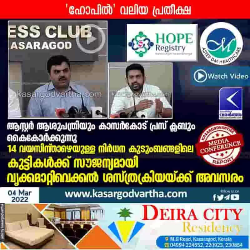 ആസ്റ്റർ ആശുപത്രിയും കാസർകോട് പ്രസ് ക്ലബും കൈകോർക്കുന്നു; 14 വയസിന് താഴെയുള്ള നിര്ധന കുടുംബങ്ങളിലെ കുട്ടികൾക്ക് സൗജന്യമായി വൃക്കമാറ്റിവെക്കല് ശസ്ത്രക്രിയയ്ക്ക് അവസരം