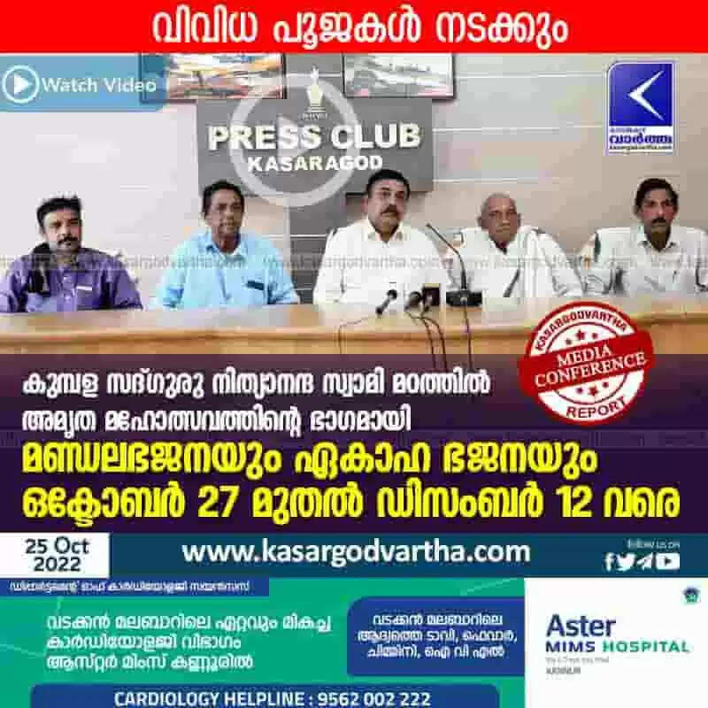 Festival | കുമ്പള സദ്ഗുരു നിത്യാനന്ദ സ്വാമി മഠത്തില് അമൃത മഹോത്സവത്തിന്റെ ഭാഗമായി മണ്ഡലഭജനയും ഏകാഹ ഭജനയും ഒക്ടോബര് 27 മുതല് ഡിസംബര് 12 വരെ