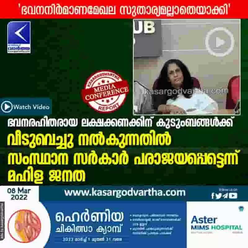 കാസർകോട്: (www.kasargodvartha.com 08.03.2022) ഭവനരഹിതരായ ലക്ഷക്കണക്കിന് കുടുംബങ്ങള്‍ക്ക് വീടുവെച്ചു നൽകുക എന്നത്‌ സംസ്ഥാനത്തിന്റെ ചുമതലയാണെന്നും എന്നാല്‍ ഈ ലക്ഷ്യം കൈവരിക്കാൻ ഫലപ്രദമായ നടപടികള്‍ സ്വീകരിക്കുന്നതിൽ കേരളസര്‍കാര്‍ പരാജയപ്പെട്ടിരിക്കുന്നുവെന്ന് മഹിള ജനത സംസ്ഥാന പ്രസിഡന്റ് ലതാമേനോന്‍ വാർത്താസമ്മേളനത്തിൽ ആരോപിച്ചു.