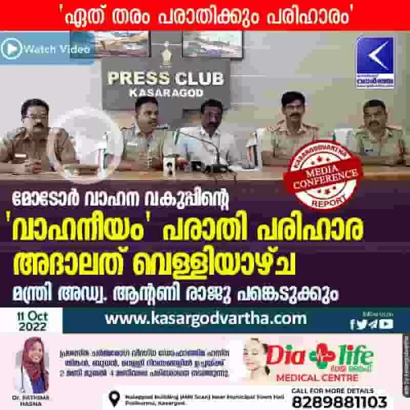 Keywords: Latest-News, Kerala, Kasaragod, Top-Headlines, Minister, Complaint, Police, Press Meet, Video, RTO, Motor Vehicle Department, Motor Vehicle Department's Complaint Redressal Adalat on 14th.