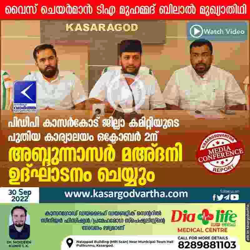 Keywords: Kasaragod, Kerala, News, Top-Headlines, Latest-News, Press meet, Video, Inauguration, Abdul Nasar Madani, Political Party, New office of PDP Kasaragod District Committee to inaugurate on October 2. < !- START disable copy paste -->