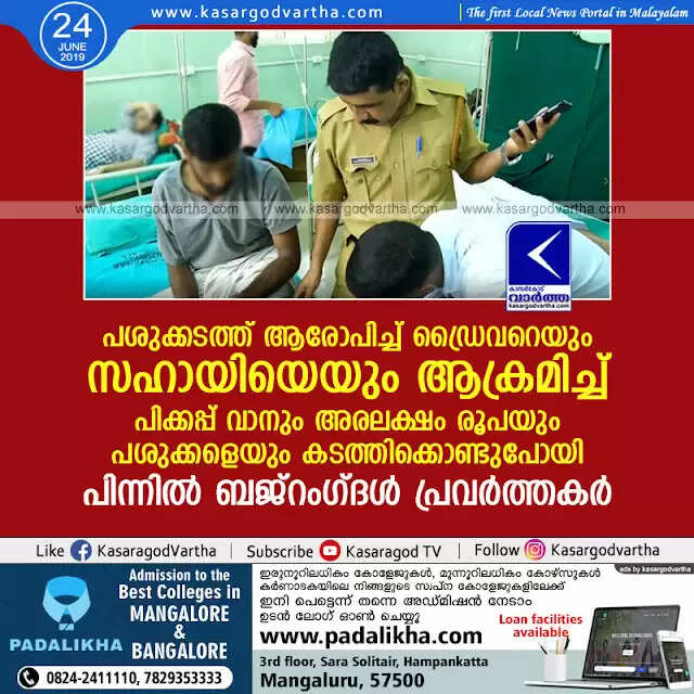 Keywords: Kasaragod, Kerala, news, Top-Headlines, Attack, Crime, cow, Driver, Pickup driver and helper attacked by BajrangDal activists