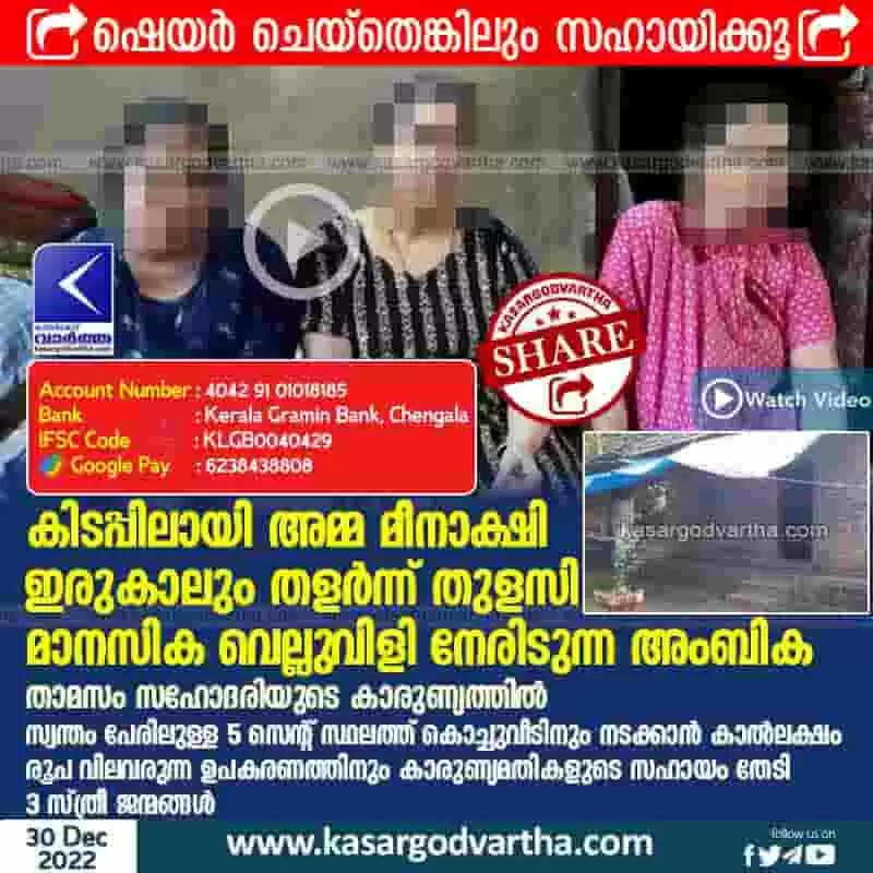 Help | കിടപ്പിലായി അമ്മ മീനാക്ഷി; ഇരുകാലും തളര്ന്ന് തുളസി; മാനസിക വെല്ലുവിളി നേരിടുന്ന അംബിക; താമസം സഹോദരിയുടെ കാരുണ്യത്തില്; സ്വന്തം പേരിലുള്ള 5 സെന്റ് സ്ഥലത്ത് കൊച്ചുവീടിനും നടക്കാന് കാല്ലക്ഷം രൂപ വിലവരുന്ന ഉപകരണത്തിനും കാരുണ്യമതികളുടെ സഹായം തേടി 3 സ്ത്രീ ജന്മങ്ങള്