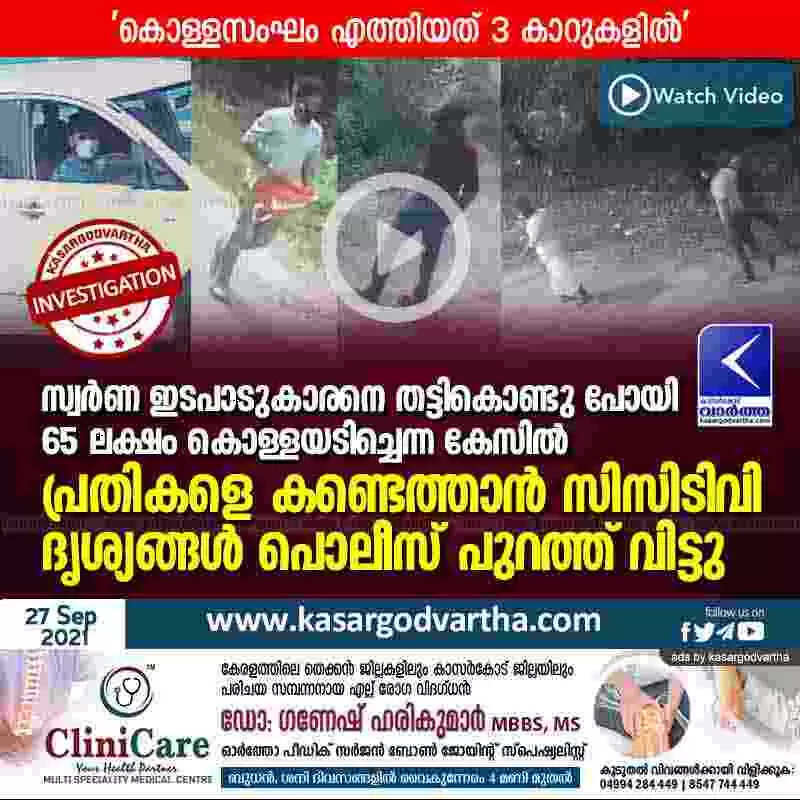 സ്വർണ ഇടപാടുകാരനെ തട്ടികൊണ്ടു പോയി 65 ലക്ഷം കൊള്ളയടിച്ചെന്ന കേസിൽ പ്രതികളെ കണ്ടെത്താൻ സി സി ടി വി ദൃശ്യങ്ങൾ പൊലീസ് പുറത്ത് വിട്ടു; 'കൊള്ളസംഘം എത്തിയത് 3 കാറുകളിൽ'