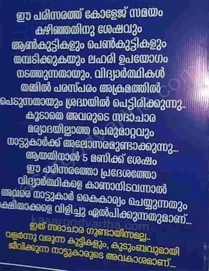 ആൺ - പെൺ വിദ്യാർഥികളിൽ ചിലർ അസാന്മാർഗിക പ്രവർത്തനങ്ങളിൽ ചെന്നുവീഴുന്നതായുള്ള പരാതികൾ ഏറിവരുന്നു; ക്ലാസിൽ നിന്ന് മുങ്ങി 3 എട്ടാം ക്ലാസ് വിദ്യാർഥിനികൾക്കൊപ്പം കറങ്ങിയ യുവാക്കളുടെ ഫോണിൽ കണ്ടത് മോശം ദൃശ്യങ്ങളെന്ന് പിടിഎ പ്രസിഡന്റ്; 5 മണിക്ക് ശേഷം കോളജ് പരിസരത്ത് കണ്ടാൽ കാല് തല്ലുമെന്ന് മറ്റൊരിടത്തെ നാട്ടുകാർ; വീഡിയോയും മുന്നറിയിപ്പ് ബോർഡും സാമൂഹ്യ മാധ്യമങ്ങളിൽ വൈറൽ