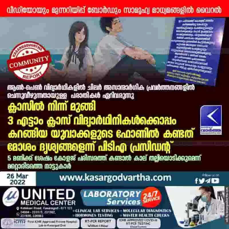 ക്ലാസ് കട് ചെയ്ത മൂന്ന് എട്ടാം ക്ലാസ് വിദ്യാർഥിനികൾക്കൊപ്പം കറങ്ങിയ യുവാക്കളുടെ ഫോണിൽ മോശം ദൃശ്യങ്ങൾ കണ്ടെന്ന പിടിഎ പ്രസിഡണ്ടിൻ്റെ രക്ഷിതാക്കൾക്കുള്ള മുന്നറിയിപ്പ് വീഡിയോ സാമൂഹ്യ മാധ്യമങ്ങളിൽ വൈറലായി. കാസർകോട് ജില്ലയിലെ ഒരു സ്‌കൂളിലെ മൂന്ന് വിദ്യാർഥിനികൾ ഇടയ്‌ക്കിടെ ക്ലാസ് കട് ചെയ്ത് മൂന്ന് യുവാക്കൾക്കൊപ്പം ബീചിലും മറ്റും പോയതായുള്ള വിവരം ലഭിച്ചതിൻ്റെ അടിസ്ഥാനത്തിൽ മൂന്ന് യുവാക്കളെയും പിടികൂടി മണിക്കൂറുകളോളം ചോദ്യം ചെയ്തതായി പിടിഎ പ്രസിഡണ്ട് വീഡിയോയിൽ പറയുന്നു.