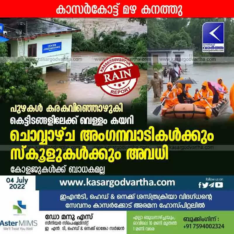 Keywords: News, Kerala, Kasaragod, Top-Headlines, Rain, School, Students, River, Issue, Heavy rain continues in Kasargod.