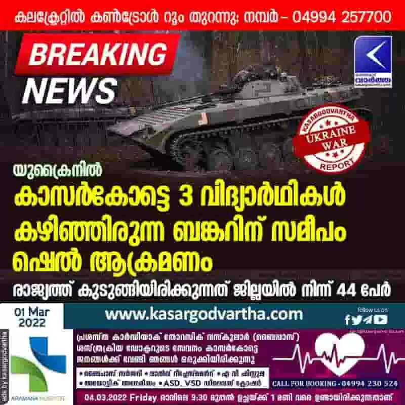 യുക്രൈനിൽ കാസർകോട്ടെ 3 വിദ്യാർഥികൾ കഴിഞ്ഞിരുന്ന ബങ്കറിന് സമീപം ഷെൽ ആക്രമണം; രാജ്യത്ത് കുടുങ്ങിയിരിക്കുന്നത് ജില്ലയിൽ നിന്ന് 44 പേർ; കലക്ട്രേറ്റിൽ കൺട്രോൾ റൂം തുറന്നു