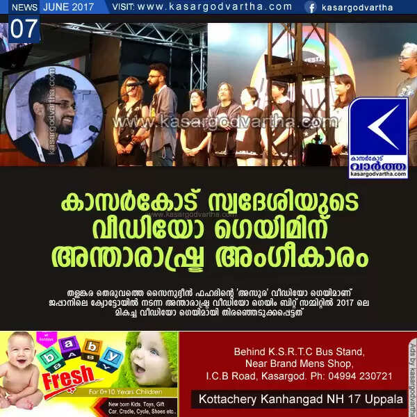 കാസര്കോട്: (www.kasargodvartha.com 07.06.2017) കാസര്കോട് തളങ്കര തെരുവത്തെ സൈനുദ്ദീന് ഫഹദിന്റെ വീഡിയോ ഗെയിമിന് അന്താരാഷ്ട്ര അംഗീകാരം. ജപ്പാനിലെ ക്യോട്ടോയില് നടന്ന അന്താരാഷ്ട്ര വീഡിയോ ഗെയിം ബിറ്റ് സമ്മിറ്റില് 2017 ലെ മികച്ച വീഡിയോ ഗെയിമായി തിരഞ്ഞെടുക്കപ്പെട്ടത് സൈനുദ്ദീന്റെ നേതൃത്വത്തില് നിര്മിച്ച അസുര എന്ന വീഡിയോ ഗെയിമാണ്.