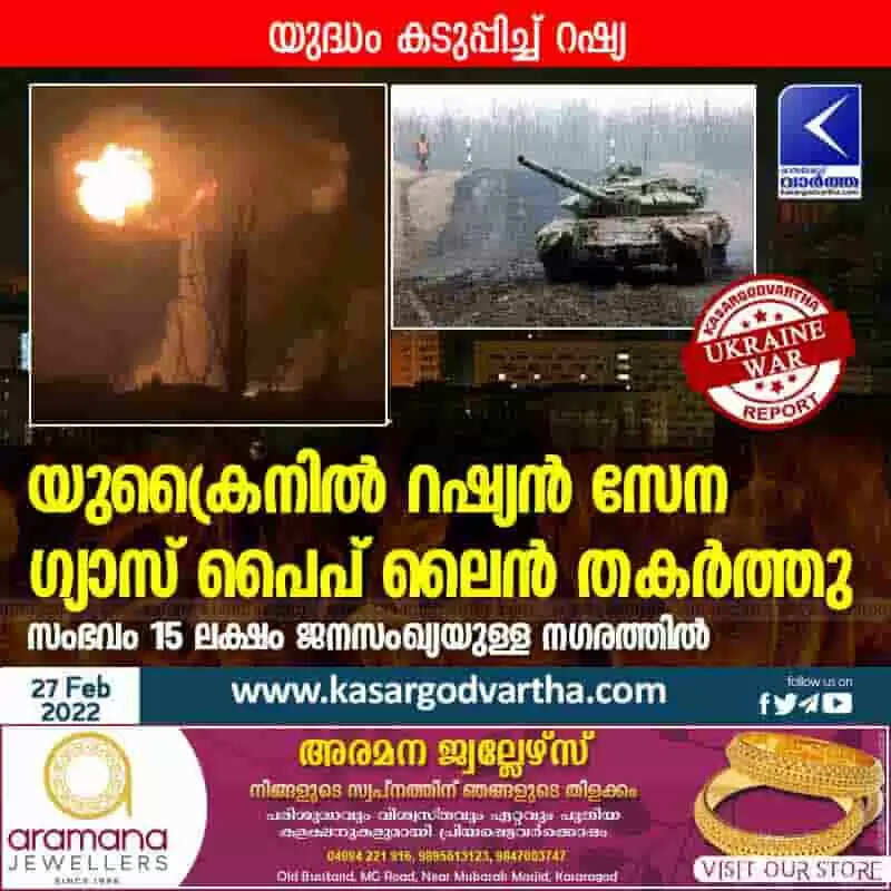 കൈവ്: (www.kasargodvartha.com 27.02.2022) രാജ്യത്തെ രണ്ടാമത്തെ വലിയ നഗരമായ ഖാര്കിവില് റഷ്യന് സൈന്യം ഗ്യാസ് പൈപ് ലൈന് തകര്ത്തതായി യുക്രൈന് പ്രസിഡന്റിന്റെ ഓഫീസ് അറിയിച്ചു. സ്ഫോടനം ഒരു പരിസ്ഥിതി ദുരന്തത്തിന് കാരണമാകുമെന്ന് സ്റ്റേറ്റ് സര്വീസ് ഓഫ് സ്പെഷ്യല് കമ്യൂനികേഷന് ആന്ഡ് ഇന്ഫര്മേഷന് പ്രൊടക്ഷന് മുന്നറിയിപ്പ് നല്കി.