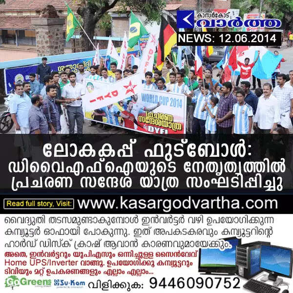 ലോകകപ്പ് ഫുട്ബോള്: ഡിവൈഎഫ്ഐയുടെ നേതൃത്വത്തില് പ്രചരണ സന്ദേശ യാത്ര സംഘടിപ്പിച്ചു